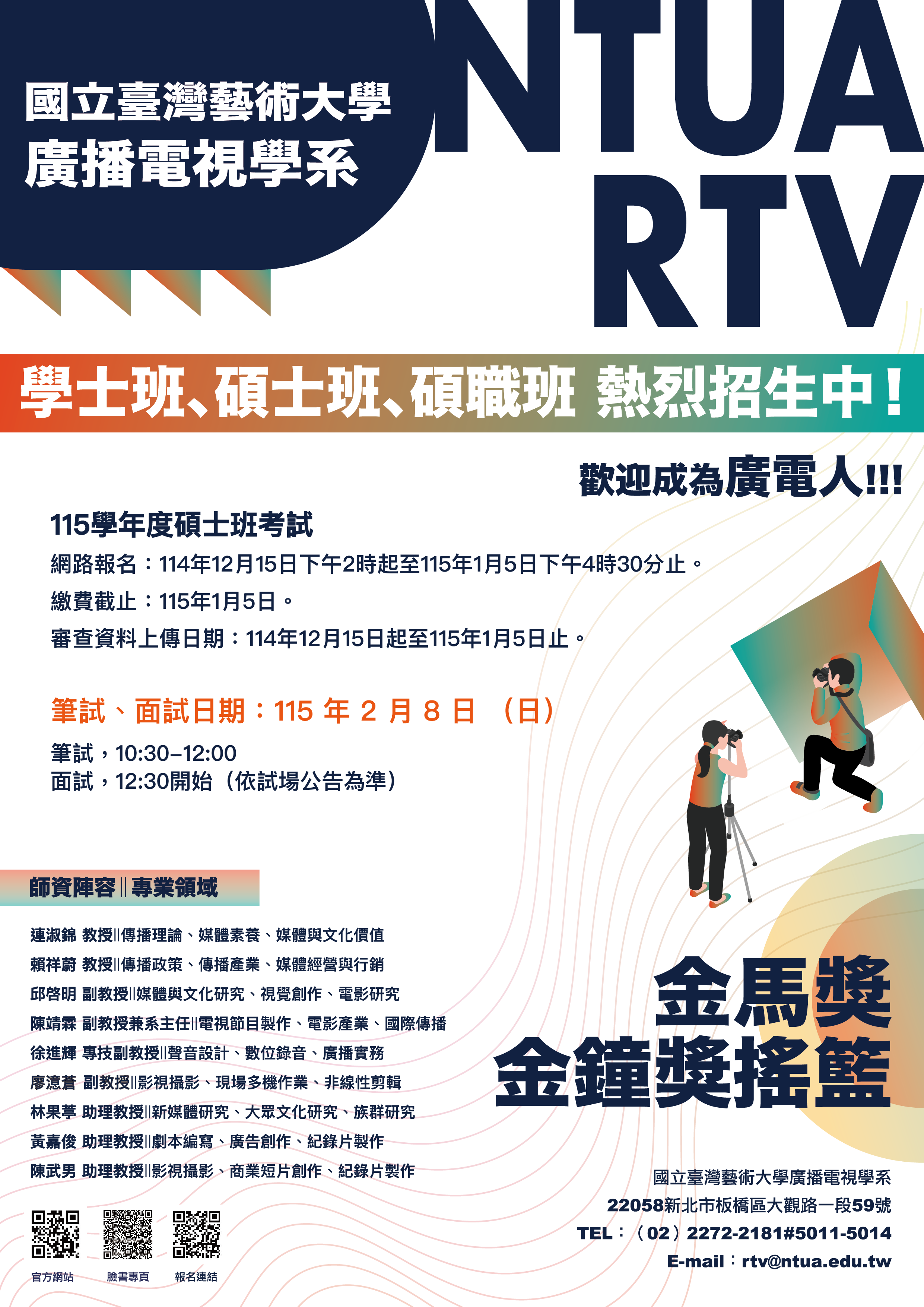 【115學年度國立臺灣藝術大學廣播電視學系日間碩士班‖考試入學‖熱烈報名,歡迎一起成為臺藝廣電人!!!】 【日間碩士班招生資訊】 →網路報名日期:114/12/15(二)1...more