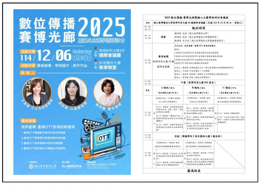 【2025數位傳播-賽博光廊暨飆心立藝學術研討會】 「2025數位傳播-賽博光廊暨標心立藝學術研討會」的倒數鐘聲已經逐漸響起,其內容也正式登場,分別有「圓桌論壇、論文發表、作品發表」,...more