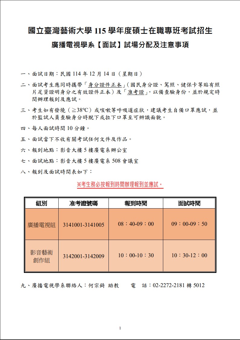 【115學年度碩在職專班試考試招生面試注意事項】 1.面試日期:114年12月14日(星期日) 2.面試考生應同時攜帶「准考證」及「身分證件正本」(國民身分證、駕照、健保卡等貼有...more
